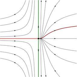 Keywords: Saddle-node phase portrait with central manifold.svg en Sadle-node singular point phase portrait with one of possible central manifolds This is a phase portrait of the simple saddle-node equation <math>\begin cases \dot x x 2\\ \dot y y\end cases </math> Its phase flow looks like <math>x t 1/ 1/x_0-t \ y t y_0 \exp t </math> And phase curves can be represented in the form <math>y x y_0\exp 1/x_0-1/x </math> ru Фазовый по т ет седлоузловой особой точки выделено одно из возможных цент альных многооб азий 2008-11-30 Own Ilya Voyager Other fields O + version 4 3 of W GNU libplot a free library for exporting 2-D vector graphics CPP import graph; import math; import metapost; size 8 inches ; defaultpen 0 45mm ; real yt real x pair z0 return z0 y exp 1/z0 x-1/x ; path trajectory pair z0 real leftmargin real rightmargin real curleftmargin leftmargin; real currightmargin rightmargin; if z0 x>0 curleftmargin 0 01; else currightmargin -0 3; return graph new real real t return yt t z0 ; curleftmargin currightmargin ; path boundary -3 -3 -- 3 -3 -- 3 3 -- -3 3 --cycle; path traj; pair inits 1 0 1 0 5 1 1 1 2 1 6 1 100 1 -0 5 1 -1 1 -2 1 -6 1 -100 -1 0 3 -1 1 -1 2 -1 3 -1 -0 3 -1 -1 -1 -2 -1 -3 -1 0 ; draw -3 0 -- 0 0 --trajectory 1 0 5 0 3 p rgb 1 0 3 0 3 +4 5 ; draw 0 -3 -- 0 3 p rgb 0 2 0 8 0 2 +4 5 ; arrowsize new real pen p currentpen return 3 5mm; ; for pair z0 inits traj trajectory z0 -3 3 ; traj lastcut traj boundary before; draw traj Arrow position 45 ; draw 0 0 1 -- 0 3 Arrow 4mm Relative 0 3 filltype NoFill Arrow 4mm Relative 0 32 filltype NoFill ; draw 0 -0 1 -- 0 -3 Arrow 4mm Relative 0 3 filltype NoFill Arrow 4mm Relative 0 32 filltype NoFill ; fill scale 0 06 unitcircle ; Dynamical systems |