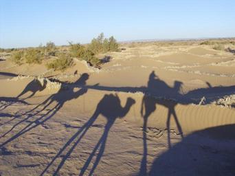 Keywords: sahara morocco desert barren sand hot camels riding shadows plants brush landscape nature outside
