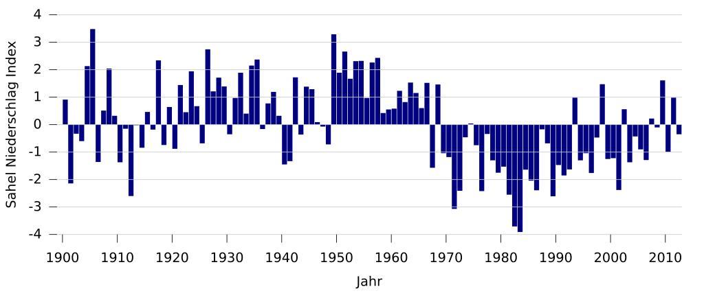 MAKE A MEME View Large Image Sahel rainfall timeseries de.svg validSVG en More than a century of rainfall data in the Sahel show an unusually wet period from 1950 until 1970 positive index values followed by extremely dry years from 1970 to 1990 negative index values ...