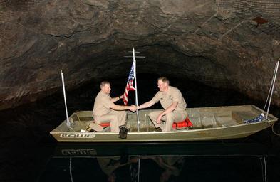 Keywords: Sailor re-enlists 2,000 feet underground 090515-N-DB216-008.jpg en Chief Yeoman Robert Lewis re-enlists aboard a temporary Navy ship 2 000 feet underground in one of four Cheyenne Mountain Air Force Station's 1 5 million gallon water reservoirs on May 15 2009 with Navy Capt Stephen Lurch Thompson director of the Cheyenne Mountain Division serving as the presiding officer CMAFS located 7 200 feet above sea level in Colorado Springs Colo is an unusual assignment location for Navy personnel and even more rare is that there are four water reservoirs inside the complex built in the 1960s and still serving today The reservoirs store water that bubbles from a natural spring located underneath the 15-building complex which today is operated and maintained by the United States Air Force Space Command For Navy personnel assigned at CMAFS located 1 500 miles from the nearest ocean the water reservoirs serve as the best place to re-enlist and observe the finest traditions of the naval service while serving in Colorado Springs 2009-05-15 U S Navy photo by Mass Communication Specialist 1st Class John James Mason/Released https //www dvidshub net/image/1269877 090515-N-DB216-008 2014-04-24 08 08 COLORADO SPRINGS CO US PD-USGov-Military-Navy Cheyene Mountain Air Force Station Images from DoD uploaded by Fæ |