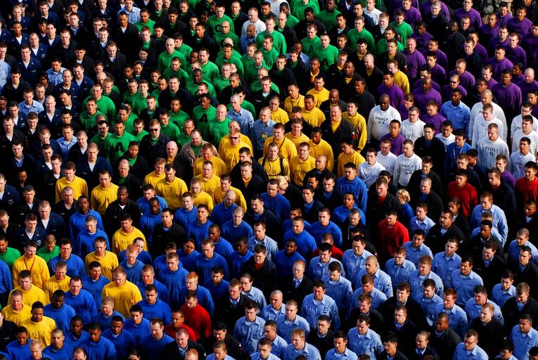 Keywords: sailors all hands deck aircraft carrier navy military people group men women crowd organized meeting announcements collection attention attentive audience