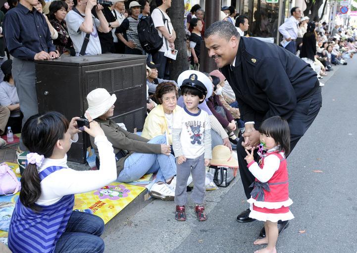 | Keywords: Sailors participate in Hakata Dontaku Festival DVIDS276603.jpg en Chief Petty Officer Palmer Pickney assigned to the U S 7th Fleet command ship USS Blue Ridge poses with children watching the Hakata Dontaku Festival Parade Blue Ridge is the flagship for Commander U S 7th Fleet U S Navy photo by Petty Officer 2nd Class Cynthia Griggs 2010-05-03 Petty Officer 2nd Class Cynthia Griggs https //www dvidshub net/image/276603 100503-N-+++++-389 2010-05-07 09 10 HAKATA JP PD-USGov-Military-Navy USS Blue Ridge LCC-19 Images from DoD uploaded by Fæ |