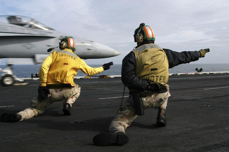 Keywords: sailors signal to launch jet aircraft carrier military plane f-18 hornet aircraft airplane ship catapult usa