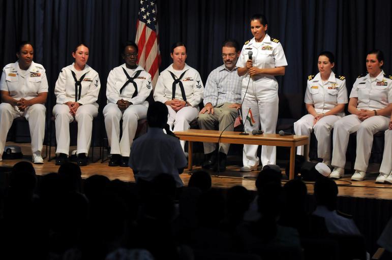 Keywords: Sailors visit India DVIDS380350.jpg en Cmdr Shanti Sethi commanding officer of the Arleigh Burke-class guided-missile destroyer USS Decatur answers a question from a female student during an event to commemorate Women's History Month while Decator is in Chennai India for a port visit Sethi and eight female sailors from Decatur participated in the event with students from various Chennai colleges and high schools Decator is on a deployment to the U S 7th Fleet area of responsibility 2011-03-17 Petty Officer 1st Class Jennifer Villalovos https //www dvidshub net/image/380350 110317-N-+++++-557 2011-03-21 17 45 CHENNAI IN PD-USGov-Military-Navy Women's History Month Images from DoD uploaded by Fæ |