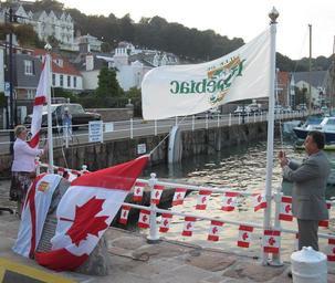 Keywords: Saint Aubîn Paspédgia Jèrri Gaspé Septembre 2009 a.jpg Dêvouailement d'eune pièrre à la caûchie d'Saint Aubîn Saint Brélade Jèrri pouor ramémouaither les lians entre Jèrri et la Côte fondés sus la pêque et l'conmèrce d'la compangnie Robîn La pièrre stchulptée auve eune carte du Gaspé fut dêvouailée par l'Gouvèrneux et Madanme Ridgway; lé Sieur Michael Birt Bailli d'Jèrri fit un discours et l'Recteu d'Saint Brélade prêchit la bénédiction; lé Sieur Ralph Maûgi fut l'organnîsateu d'l'êchangedes monuments entre Jèrri et Paspédgia 18 September 2009 unveiling of monument in Saint Aubin commemorating the historic links between Jersey and the Gaspé A corresponding monument has also been inaugurated in Paspébiac Inauguration d'un monument rappelant l'histoire des pêcheries jersiaises en Gaspésie fondées par le marchand jersiais Charles Robin de Saint-Aubîn own own photo 2009-09-18 Man vyi Own work all rights released Public domain Saint Aubin harbour Memorial stones in Jersey September 2009 Paspébiac Sir Andrew Peter Ridgway Photographs of flags of Jersey Photographs of the national flag of Canada People with flags 2009 in Jersey Flags of cities and regions in Quebec National flag of Canada with other flags Flags in Jersey Coasts of Quebec