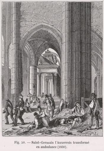 | Keywords: Saint-Germain l'Auxerrois transformé en ambulance, 1830.jpg Artwork An 1830 portrayal of Saint-Germain l'Auxerrois which was used to care for the wounded during the July Revolution Although this church was nearly abolished in the years to follow protesters insisted on its historical meaning and symbolism and it was eventually restored 1875-1882 lithograph 10 4 x 7 8 cm Institution Brown University Library object history exhibition history credit line Published in Theodor Josef Hubert Hoffbauer Paris à travers les âges Paris Firmin-Didot et cie 1885 accession number 1172175858649850 PD-old Lithographs of Paris Images of Paris from the Brown University Library Paris à travers les âges Historical images of Église Saint-Germain-l'Auxerrois Military hospitals in France French Revolution of 1830 |