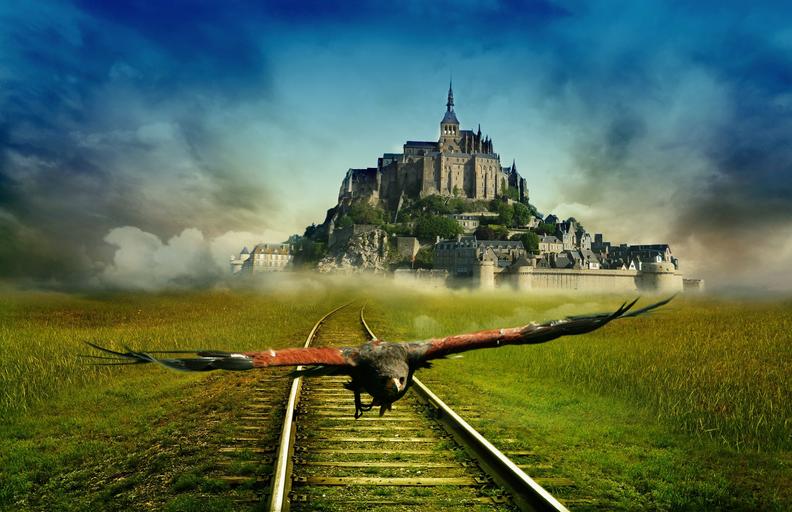 Keywords: saint michel brittany monastery france castle road train landscape storm clouds fantasy eagle bird bird of prey fly span wings