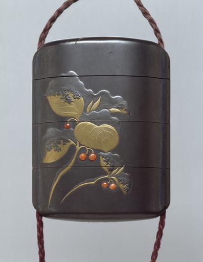 | Keywords: Sakai Hoitsu - Inro with Pine and Snow-Covered Ardisia Japonica - Walters 67415 - View A.jpg A standard oblong grey lacquer three case inro On one side a snow-covered yabukoji in hiramakie in gold with berries in applied carnelain on a grey lacquer round On the other side a pine branch with a pine cone in gold Inscribed in gold near the pine tree and a red seal Inscribed on the bottom of the lower case with the inro artist's name The interior of red lacquer and fundame The cord channels are external Together with a carved ivory netsuke seal of a shishi on a ball all on a rectangular platform late Other date century 18 Edo lacquer carnelian inlay gold ivory inro cm 7 4 5 6 2 2 accession number 67 415 22782 William T / Henry Walters Collection Baltimore date and mode of acquisition unknown Walters Art Museum Henry Walters Acquired by William T or Henry Walters Designer Hoitsu hitsu; Seal Keikyo; Signature Yoyusai; Translation After the design of Hoitsu place of origin Edo present-day Tokyo Japan Walters Art Museum license Inro in the Walters Art Museum Sakai Hoitsu Hara Yoyusai Ardisia japonica |