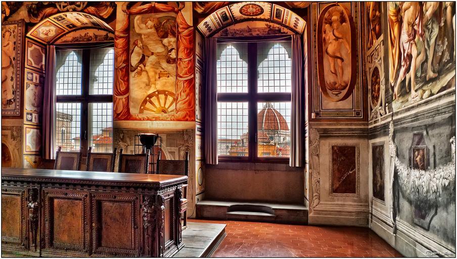 | Keywords: sala udienza signori palazzo vecchio florence hall audience cathedral duomo nik color efex pro viveza sns hdr +3xp 3xp architecture door indoor The Sala dell'Udienza dei Signori (the Hall of the Audience) on the third floor of the Palazzo Vecchio was decorated by Francesco Salviati in 1545 and depicts scenes from the life of the Roman general Marcus Furius Camillus and biblical allegories. The intent was to equate Cosimo I with Camillus, the saviour and second founder of Rome in the 4th century BC. The dome of the Cathedral of Florence is visible through the window. This is a three shot HDR that I almost deleted because the +3 shot was still too dark to get much detail. I used a lot of fill light to recover but that brought out a lot of noise. There was a lot of movement between the shots too but SNS HDR did a great job of aligning them. The Sala dell'Udienza dei Signori (the Hall of the Audience) on the third floor of the Palazzo Vecchio was decorated by Francesco Salviati in 1545 and depicts scenes from the life of the Roman general Marcus Furius Camillus and biblical allegories. The intent was to equate Cosimo I with Camillus, the saviour and second founder of Rome in the 4th century BC. The dome of the Cathedral of Florence is visible through the window. This is a three shot HDR that I almost deleted because the +3 shot was still too dark to get much detail. I used a lot of fill light to recover but that brought out a lot of noise. There was a lot of movement between the shots too but SNS HDR did a great job of aligning them. |
