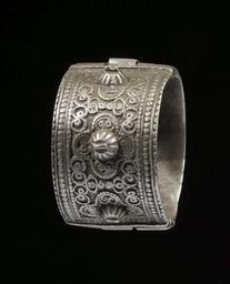 Keywords: Salim - Bracelet - Walters 572316 - View A.jpg The bracelet is made of two equal halves and has three serrated halfglobules on each side The decoration combines spirals and circles; a triple bead-molded band frames the décor Inside of the bracelet is an engraved inscription in Hebrew which names the silversmith in Hebrew Sa lim xxx century 19 silver cast remains of green glass Outer diam cm 5 2 ; Inner diam 1 15/16 x W 1 7/16 in 4 9 x 3 7 cm accession number 57 2316 80920 Mr Benjamin Zucker Zucker Family Trust and Mr Derek Content New York and London by purchase Walters Art Museum Joint gift to the Walters Art Museum Baltimore and the Israel Museum Jerusalem by Mr Benjamin Zucker and Mr Derek Content in honor of Mrs Barbara Zucker and Mrs Amanda Content 2010 Engraving Hebrew Sa lim xxx place of origin northern Yemen Walters Art Museum license Jewellery in the Walters Art Museum South Arabian art in the Walters Art Museum Salim silversmith Media contributed by the Walters Art Museum needs category review |