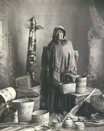 | Keywords: Salishan Indian woman with basket and native art collection, Alaska, ca 1893 (LAROCHE 183).jpeg check categories 9 June 2016 3 Photograph Creator Frank La Roche Salishan basketmaker ca 18901895 Older woman stands wearing blanket on shoulders and a kerchief; she has a rolled mat on her back and a basket in her hand Around her are many baskets Tlingit Salish and Athapascan and some carvings probably Tlingit She is posed in front of a painted backdrop of an arbor Caption on image Siwash basket maker Tlingit Salish and Athabaskan artifacts Subjects LCSH Portraits--Washington State ; Salishan Indians--Arts crafts; Indians of North America--Northwest Coast of North America--Arts crafts; Baskets--Indians of North America--Northwest Coast of North America; Wood carvings--Indians of North America--Northwest Coast of North America depicted place Alaska ca 1893 Institution University of Washington UWASH-LAROCHE-source accession number laroche 183 PD-old-auto-1923 1936 Information field Order Number LAR134 Images from the Frank La Roche Photographs Collection to check Portraits Baskets Alaska |
