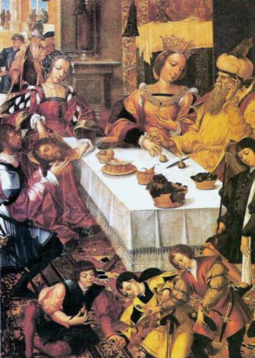 Keywords: Salomé apresentando a cabeça do santo.jpg pt O mesmo mensageiro que recebera a cabeça de S João entrega-a agora a Salomé passando de um quadro para o outro Ninguém dá muita atenção ao Santo que foi sacrificado quase como se quisessem ignorar ou estivessem arrependidos do que tinham feito Na sala ao fundo homens conversam como se nada tivesse acontecido; o mesmo se passa com o rei e a rainha que estão distraidamente à mesa ou as crianças que brincam em primeiro plano Mesmo Salomé parece dar mais atenção ao mensageiro do que a própria cabeça do Santo a quem tanto desejou a morte Apesar da acção ter decorrido no século I os personagens estão vestidos como se tudo acontecesse no século XVI quando o quadro foi pintado Isso permite-nos saber qual era a moda e o gosto desse século 2013-01-11 10 55 44 http //www ttt ipt pt Creator Gregório Lopes PD-old-100 Uploaded with UploadWizard Gregório Lopes Salome with the head of John the Baptist Herodias |