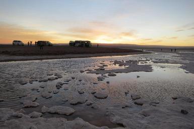Keywords: salt lake atacama desert desert dry chile landscape south america altiplano andes sky hot arid environment extreme heat travel expedition tourism adventure laguna cejar water sand sunset busses sight seeing people