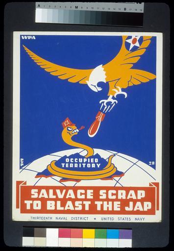 | Keywords: Salvage Scrap propaganda poster orig.jpg Poster for Thirteenth Naval District United States Navy showing a snake representing Japan being bombed by an eagle An example of American propaganda during World War II http //hdl loc gov/loc pnp/cph 3b49009 Library of Congress or 1940 1941 Phil Phul File Salvage Scrap propaganda poster orig tif Original TIF File Salvage Scrap propaganda poster orig jpg Original JPG File Salvage Scrap propaganda poster crop2 jpg This version has been restored Rotated with perspective crop Dirt smudges and small creases corrected Histogram adjusted File Salvage Scrap propaganda poster crop2 tif uncompressed restoration PD-USGov World War II propaganda |
