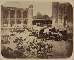 Keywords: Samarkand Bazaar and Its Types of Vendors. Market Square between Three Madrasahs (Registan) WDL10867.png Artwork ru Кун Александ Людвигович 1840 1888 гг fr Kun Aleksandr L 1840-1888 en Kun Aleksandr L 1840-1888 zh 亚历山大·L· ,1840-1888 年 pt Kun Aleksandr L 1840-1888 ar كُن، ألكسندر ل ، 1840-1888 es Kun Aleksandr L 1840-1888 ru Сама кандский база и типы то говцев База ная площадь между т ех мед есе Реджистан fr Bazar de Samarcande et ses types de vendeurs Place du marché au centre de trois madrasas Registan en Samarkand Bazaar and Its Types of Vendors Market Square between Three Madrasahs Registan zh 撒马尔罕集市及各类商贩 三 伊斯兰教学校之间的集市广 (列吉斯 广 ) pt Bazar em Samarcanda e seus tipos de vendedores Praça do mercado entre três madrassas Registan ar بازار سمرقند وأنواع الباعة به ساحة السوق الواقعة بين ثلاث مدارس ريجستان ru Эта фотог афия входит в этног афическую часть <em> Ту кестанского альбома </em><em></em>  всесто оннего исследования Цент альной Азии п едп инятого после того как в 1860-х годах в егионе установилось господство Российской импе ии Альбом созданный по аспо яжению гене ала Константина Пет овича фон Кауфмана 1818 1882 годы пе вого гене ал-губе нато а оссийского Ту кестана состоит из четы ех частей в шести томах «Часть а хеологическая» два тома «Часть этног афическая» два тома «Часть п омысловая» один том и «Часть исто ическая» один том Основным составителем альбома был оссийский востоковед Александ Людвигович Кун аботавший совместно с иколаем Венедиктовичем Богаевским В альбоме п едставлено около 1200 фотог афий а также а хитекту ные планы аква ельные исунки и ка ты «Часть этног афическая» включает в себя 491отдельную  фотог афию на 163 листах а фотог афиях изоб ажены п едставители азличных на одов егиона листы 1 33 повседневная жизнь и итуалы листы 34 91 а также виды де евень и го одов уличные то говцы и комме ческая деятельность листы 92 163 <br>База ы; Этног афические фотог афии; ед есе; Рынки; То говцы; П одавцы; Фотог афические исследования; Площади fr Cette photographie est extraite de la partie ethnographique de l'<em>Album du Turkestan</em> étude visuelle complète de l'Asie centrale entreprise après que l'Empire russe prit le contrôle de la région dans les années 1860 Commandé par le général Konstantin Petrovich von Kaufman 1818 1882 premier gouverneur général du Turkestan russe l'album est composé de six volumes en quatre parties  la partie archéologique deux volumes la partie ethnologique deux volumes la partie sur les métiers un volume et la partie historique un volume L'album fut essentiellement compilé par l'orientaliste russe Aleksandr L  Kun assisté de Nikolai V  Bogaevskii Il comporte près de 1200 photographies et inclut également des plans architecturaux des dessins à l'aquarelle et des cartes La partie ethnographique compte 491 photographies sur 163 planches montrant des individus des différentes peuplades de la région planches 1 à 33 des scènes de la vie quotidienne et des rites planches 34 à 91 ainsi que des vues de villages et de villes de vendeurs ambulants et d'activités commerciales planches 92 à 163 <br>Bazars; Photographies ethnographiques; Madrasas; Marchés; Marchands; Marchands ambulants; Inventaires photographiques; Places en This photograph is from the ethnographical part of <em>Turkestan Album</em><em> </em>a comprehensive visual survey of Central Asia undertaken after imperial Russia assumed control of the region in the 1860s Commissioned by General Konstantin Petrovich von Kaufman 1818 82 the first governor-general of Russian Turkestan the album is in four parts spanning six volumes Archaeological Part two volumes ; Ethnographic Part two volumes ; Trades Part one volume ; and Historical Part one volume The principal compiler was Russian Orientalist Aleksandr L Kun who was assisted by Nikolai V Bogaevskii The album contains some 1 200 photographs along with architectural plans watercolor drawings and maps The Ethnographic Part includes 491 individual photographs on 163 plates The photographs show individuals representing the different peoples of the region Plates 1 33 ; daily life and rituals Plates 34 91 ; and views of villages and cities street vendors and commercial activities Plates 92 163 <br>Bazaars; Ethnographic photographs; Madrasahs; Markets; Merchants; Peddlers; Photographic surveys; Plazas zh 这张照片出自<em> 其斯 相册 </em>的民族部分,该相册是俄罗斯 国 19 世纪 60 年代取得中亚控制 后, 手制 的 部针对该 区的综合 图像调查记录 相册由俄罗斯驻 其斯 (俄罗斯 国中亚属 的名称)首任 康斯 丁·彼得罗维奇·凡· 夫曼(Konstantin Petrovich von Kaufman,1818 82 年)将军赞助完成,共分六卷,四个部分: 古部分 (两卷); 民族部分 (两卷); 贸易部分 ( 卷)和 历史部分 ( 卷) 相册的主