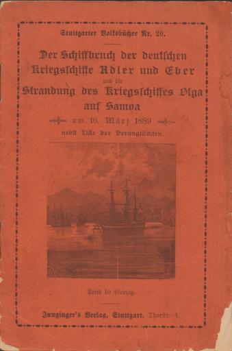| Keywords: Samoa.JPG  de Der Schiffbruch der deutschen Kriegsschiffe Adler und Eber und die Strandung des Kriegsschiffes Olga auf Samoa am 16 März 1889 nebst Liste der Verunglückten Junginger's Verlag Stuttgart Thorstr 4 Stuttgarter Volkerbücher 20 16 Seiten Beschreibung des Unglücks 3 Seiten Liste der Opfer nach Name Rang und Herkunft of the accident 3 pages list of victims by name rank and origin Scan des Covers eines Buches im eigenen Besitz Volkerj 2011-12-30 Cc-zero SMS Eber ship 1887 Olga ship 1881 1889 works Adler ship 1883 History of Samoa Red cover books |