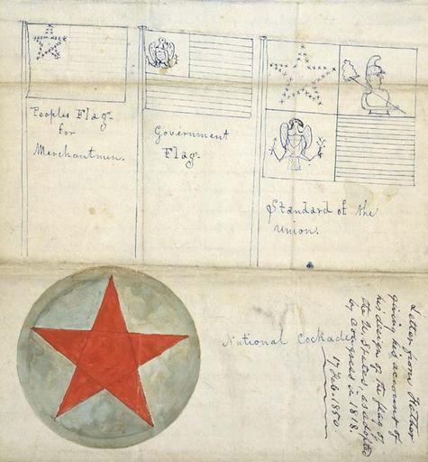 Keywords: Samuel Reid proposed U.S. Flag designs.jpg Sketches made by Samuel Chester Reid in 1850 in a letter to his son showing his proposed designs for various U S flags when he was a central part of Congressional discussions in 1817 Reid came up with the concept of having 13 stripes while adding stars to represent the states which was the definition chosen for the Flag Act of 1818 which is still in force today Reid recommended arranging the stars in a larger star which in fact was used in the first flag flown over the Capitol following the 1818 law but shortly thereafter horizontal rows became customary Reid actually proposed three flags the people's flag a governmental flag with the stars replaced by the coat of arms so to better distinguish merchant from government ships and a national standard to be used on ceremonial occasions such as inaugurations This last flag was reminiscent of the British royal standard and had four quarters one with the stars on a blue background another with the coat of arms on a white background another with the Goddess of Liberty on a white background and the last with the 13 red and white stripes Other accounts of the Congressional committee letters show the eagle and goddess quarters switched from this sketch; perhaps they were changed in discussions before being dropped altogether Reid also proposed a national cockade a symbol worn on military uniforms None of Reid's additional suggestions were adopted nor were they seriously considered Text Peoples flag for Merchantmen Government flag Standard of the unions National cockade Letter from Father giving his account of his design of the flag of the U States as adopted by Congress in 1818 17 Feb 1850 http //www loc gov/exhibits/treasures/trm098 html direct image URL http //www loc gov/exhibits/treasures/images/vc26 7p4 jpg Library of Congress Manuscript Division 26 7 page 4 1850-02-17 Samuel Chester Reid File Samuel Reid proposed national standard jpg PD-old Historical flags of the United States Proposed flags Cockades of the United States |