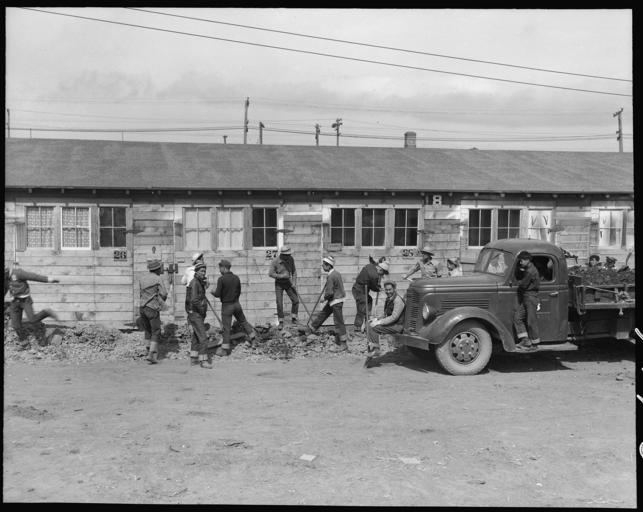 Keywords: San Bruno, California. All maintenance work, repair and construction is done by volunteer workers o . . . - NARA - 537926.jpg Scope and content The full caption for this photograph reads San Bruno California All maintenance work repair and construction is done by volunteer workers of Japanese ancestry The wages are 8 00 per month for 48 hours a week This gang of boys and young men digging a drainage tank along the front of one of the barracks General notes 537926 Local identifier 210-G-C626 Department of the Interior War Relocation Authority 02/16/1944 - 06/30/1946 NARA-Author Lange Dorothea 1895-1965 Photographer 1372774 <br /> Still Picture Records Section Special Media Archives Services Division NWCS-S National Archives at College Park 8601 Adelphi Road College Park MD 20740-6001 1942-06-16 Record group Record Group 210 Records of the War Relocation Authority 1941 - 1989 Record group ARC 537 Central Photographic File of the War Relocation Authority compiled 1942 - 1945 Series ARC 536000 File unit File unit ARC Variant control numbers NAIL Control Number NWDNS-210-G-C626 Other versions <gallery> File San_Bruno _California _All_maintenance_work _repair_and_construction_is_done_by_volunteer_workers_o_ _ _ _-_NARA_-_537926 tif tif File San_Bruno _California _All_maintenance_work _repair_and_construction_is_done_by_volunteer_workers_o_ _ _ _-_NARA_-_537926 jpg jpg </gallery> NARA-cooperation PD-USGov Dorothea Lange Tanforan Assembly Center Construction workers in the United States |