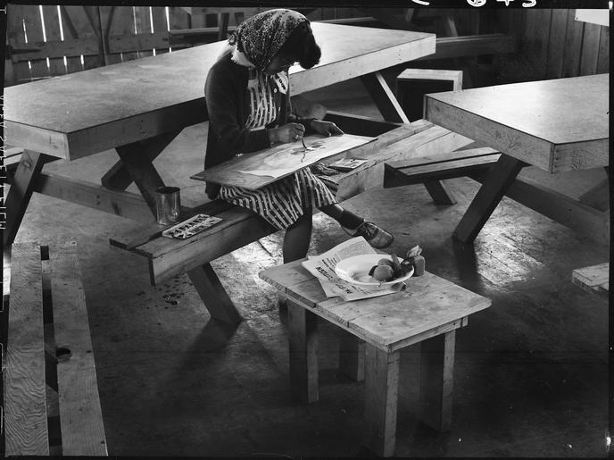 | Keywords: San Bruno, California. An art school wall has been established in this Assembly center with large e . . . - NARA - 537945.tif Scope and content The full caption for this photograph reads San Bruno California An art school wall has been established in this Assembly center with large enrollment and a well trained experienced Japanese staff under the leadership of Professor Chiura Obata of the University of California This photograph shows a student in Still Life class painting a free water color General notes 537945 Local identifier 210-G-C645 Department of the Interior War Relocation Authority 02/16/1944 - 06/30/1946 NARA-Author Lange Dorothea 1895-1965 Photographer 1372774 <br /> Still Picture Records Section Special Media Archives Services Division NWCS-S National Archives at College Park 8601 Adelphi Road College Park MD 20740-6001 1942-06-16 Record group Record Group 210 Records of the War Relocation Authority 1941 - 1989 Record group ARC 537 Central Photographic File of the War Relocation Authority compiled 1942 - 1945 Series ARC 536000 File unit File unit ARC Variant control numbers NAIL Control Number NWDNS-210-G-C645 yes Other versions <gallery> File San_Bruno _California _An_art_school_wall_has_been_established_in_this_Assembly_center_with_large_e_ _ _ _-_NARA_-_537945 tif tif File San_Bruno _California _An_art_school_wall_has_been_established_in_this_Assembly_center_with_large_e_ _ _ _-_NARA_-_537945 jpg jpg </gallery> NARA-cooperation PD-USGov NARA TIF images with categorized JPGs Tanforan Assembly Center Dorothea Lange Building interiors in California Chiura Obata |