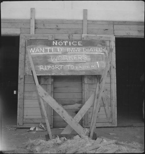 Keywords: San Bruno, California. "Help Wanted" sign displayed for newly arrived evacuees. There was much wo . . . - NARA - 537668.jpg Scope and content The full caption for this photograph reads San Bruno California Help Wanted sign displayed for newly arrived evacuees There was much work to be done since the center was opened on the previous day Three weeks later there were 8 000 persons of Japanese ancestry in this center General notes 537668 Local identifier 210-G-C322 Department of the Interior War Relocation Authority 02/16/1944 - 06/30/1946 NARA-Author Lange Dorothea 1895-1965 Photographer 1372774 <br /> Still Picture Records Section Special Media Archives Services Division NWCS-S National Archives at College Park 8601 Adelphi Road College Park MD 20740-6001 1942-04-29 Record group Record Group 210 Records of the War Relocation Authority 1941 - 1989 Record group ARC 537 Central Photographic File of the War Relocation Authority compiled 1942 - 1945 Series ARC 536000 File unit File unit ARC Variant control numbers NAIL Control Number NWDNS-210-G-C322 Other versions <gallery> File San_Bruno _California _ Help_Wanted _sign_displayed_for_newly_arrived_evacuees _There_was_much_wo_ _ _ _-_NARA_-_537668 tif tif File San_Bruno _California _ Help_Wanted _sign_displayed_for_newly_arrived_evacuees _There_was_much_wo_ _ _ _-_NARA_-_537668 jpg jpg </gallery> NARA-cooperation PD-USGov Dorothea Lange Tanforan Assembly Center