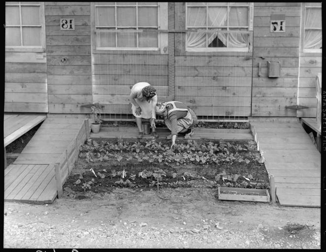 Keywords: San Bruno, California. Mrs. Fujita and her neighbor inspecting the tiny vegetable garden she has p . . . - NARA - 537911.jpg Scope and content The full caption for this photograph reads San Bruno California Mrs Fujita and her neighbor inspecting the tiny vegetable garden she has planted in front of their barracks General notes 537911 Local identifier 210-G-C610 Department of the Interior War Relocation Authority 02/16/1944 - 06/30/1946 NARA-Author Lange Dorothea 1895-1965 Photographer 1372774 <br /> Still Picture Records Section Special Media Archives Services Division NWCS-S National Archives at College Park 8601 Adelphi Road College Park MD 20740-6001 1942-06-16 Record group Record Group 210 Records of the War Relocation Authority 1941 - 1989 Record group ARC 537 Central Photographic File of the War Relocation Authority compiled 1942 - 1945 Series ARC 536000 File unit File unit ARC Variant control numbers NAIL Control Number NWDNS-210-G-C610 Other versions <gallery> File San_Bruno _California _Mrs _Fujita_and_her_neighbor_inspecting_the_tiny_vegetable_garden_she_has_p_ _ _ _-_NARA_-_537911 tif tif File San_Bruno _California _Mrs _Fujita_and_her_neighbor_inspecting_the_tiny_vegetable_garden_she_has_p_ _ _ _-_NARA_-_537911 jpg jpg </gallery> NARA-cooperation PD-USGov Dorothea Lange Tanforan Assembly Center |