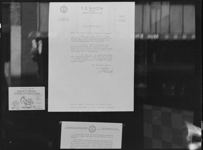 | Keywords: San Francisco, California. Farewell letter posted in show window of T.Z. Shiota, importer in San Fr . . . - NARA - 536414.jpg Scope and content The full caption for this photograph reads San Francisco California Farewell letter posted in show window of T Z Shiota importer in San Francisco's Chinatown prior to evacuation of residents of Japanese ancestry Evacuees will be housed at War Relocation Authority centers for the duration General notes 536414 Local identifier 210-G-A522 Department of the Interior War Relocation Authority 02/16/1944 - 06/30/1946 NARA-Author Lange Dorothea 1895-1965 Photographer 1372774 <br /> Still Picture Records Section Special Media Archives Services Division NWCS-S National Archives at College Park 8601 Adelphi Road College Park MD 20740-6001 04/1942 Record group Record Group 210 Records of the War Relocation Authority 1941 - 1989 Record group ARC 537 Central Photographic File of the War Relocation Authority compiled 1942 - 1945 Series ARC 536000 File unit File unit ARC Variant control numbers NAIL Control Number NWDNS-210-G-A522 Other versions <gallery> File San_Francisco _California _Farewell_letter_posted_in_show_window_of_T Z _Shiota _importer_in_San_Fr_ _ _ _-_NARA_-_536414 tif tif File San_Francisco _California _Farewell_letter_posted_in_show_window_of_T Z _Shiota _importer_in_San_Fr_ _ _ _-_NARA_-_536414 jpg jpg </gallery> NARA-cooperation PD-USGov Dorothea Lange Japanese American internment processing in San Francisco |