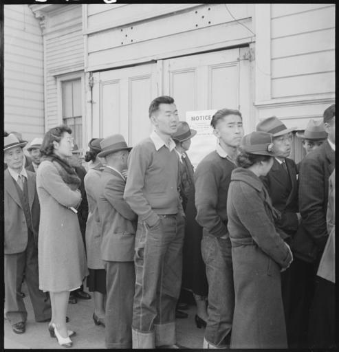 | Keywords: San Francisco, California. In response to the Army's Exclusion Order Number 20, residents of Japane . . . - NARA - 536410.jpg Scope and content The full caption for this photograph reads San Francisco California In response to the Army's Exclusion Order Number 20 residents of Japanese ancestry appear at Civil Control Station at 2031 Bush Street for registration The evacuees will be housed in War Relocation Authority centers for the duration General notes 536410 Local identifier 210-G-A518 Department of the Interior War Relocation Authority 02/16/1944 - 06/30/1946 NARA-Author Lange Dorothea 1895-1965 Photographer 1372774 <br /> Still Picture Records Section Special Media Archives Services Division NWCS-S National Archives at College Park 8601 Adelphi Road College Park MD 20740-6001 1942-04-25 Record group Record Group 210 Records of the War Relocation Authority 1941 - 1989 Record group ARC 537 Central Photographic File of the War Relocation Authority compiled 1942 - 1945 Series ARC 536000 File unit File unit ARC Variant control numbers NAIL Control Number NWDNS-210-G-A518 Other versions <gallery> File San_Francisco _California _In_response_to_the_Army's_Exclusion_Order_Number_20 _residents_of_Japane_ _ _ _-_NARA_-_536410 tif tif File San_Francisco _California _In_response_to_the_Army's_Exclusion_Order_Number_20 _residents_of_Japane_ _ _ _-_NARA_-_536410 jpg jpg </gallery> NARA-cooperation PD-USGov Dorothea Lange Japanese American internment processing in San Francisco |