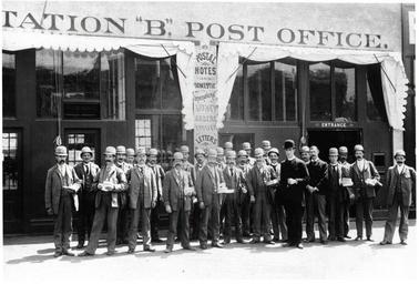 | Keywords: smithsonian institution smithsonianinstitution san francisco sanfrancisco california usps postoffice jackson street jacksonstreet 1906 earthquake 1906earthquake domestic mail domesticmail grand opening grandopening bowler hats bowlerhats men station b stationb post office national postal museum nationalpostalmuseum mail across the commons mailacrossthecommons blackandwhite black and white Description: The staff of San Francisco's Station "B" Post Office poses in front of their building. Creator/Photographer: Unidentified photographer Medium: Black and white photographic print Geography: USA Date: 1890 Collection: U.S. Postal Employees Persistent URL: arago.si.edu/index.asp?con=2&cmd=1&id=194281 Repository: National Postal Museum Accession number: A.2006-29 Description: The staff of San Francisco's Station "B" Post Office poses in front of their building. Creator/Photographer: Unidentified photographer Medium: Black and white photographic print Geography: USA Date: 1890 Collection: U.S. Postal Employees Persistent URL: arago.si.edu/index.asp?con=2&cmd=1&id=194281 Repository: National Postal Museum Accession number: A.2006-29 |