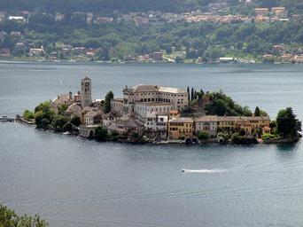 Keywords: san giulio italy island buildings palace castle architecture lake water trees shoreline ships boats nature outside