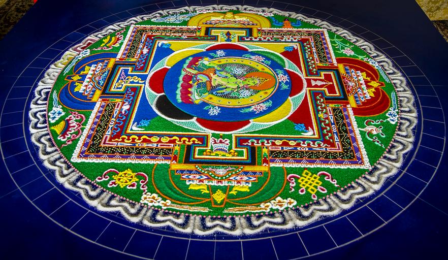 Keywords: circle round indoor Tara (Sanskrit: तारा, tārā; Tib. སྒྲོལ་མ, Dölma) or Ārya Tārā, also known as Jetsun Dölma (Tibetan language:rje btsun sgrol ma) in Tibetan Buddhism, is a female Bodhisattva in Mahayana Buddhism who appears as a female Buddha in Vajrayana Buddhism. She is known as the "mother of liberation", and represents the virtues of success in work and achievements. She is known as Tara Bosatsu (多羅菩薩) in Japan, and occasionally as Duōluó Púsà (多羅菩薩) in Chinese Buddhism. The most widely known forms of Tārā are: Green Tārā, (Syamatara) known as the Buddha of enlightened activity. en.wikipedia.org/wiki/Tara_(Buddhism) The Sand Mandala (Tibetan: དཀྱིལ་འཁོར།, Wylie: dkyil 'khor; Chinese: 沙坛城; pinyin: Shā Tánchéng) is a Tibetan Buddhist tradition involving the creation and destruction of mandalas made from coloured sand. A sand mandala is ritualistically dismantled once it has been completed and its accompanying ceremonies and viewing are finished to symbolize the Buddhist doctrinal belief in the transitory nature of material life. en.wikipedia.org/wiki/Sand_mandala Tara (Sanskrit: तारा, tārā; Tib. སྒྲོལ་མ, Dölma) or Ārya Tārā, also known as Jetsun Dölma (Tibetan language:rje btsun sgrol ma) in Tibetan Buddhism, is a female Bodhisattva in Mahayana Buddhism who appears as a female Buddha in Vajrayana Buddhism. She is known as the "mother of liberation", and represents the virtues of success in work and achievements. She is known as Tara Bosatsu (多羅菩薩) in Japan, and occasionally as Duōluó Púsà (多羅菩薩) in Chinese Buddhism. The most widely known forms of Tārā are: Green Tārā, (Syamatara) known as the Buddha of enlightened activity. en.wikipedia.org/wiki/Tara_(Buddhism) The Sand Mandala (Tibetan: དཀྱིལ་འཁོར།, Wylie: dkyil 'khor; Chinese: 沙坛城; pinyin: Shā Tánchéng) is a Tibetan Buddhist tradition involving the creation and destruction of mandalas made from coloured sand. A sand mandala is ritualistically dismantled once it has been completed and its accompanying ceremonies and viewing are finished to symbolize the Buddhist doctrinal belief in the transitory nature of material life. en.wikipedia.org/wiki/Sand_mandala |