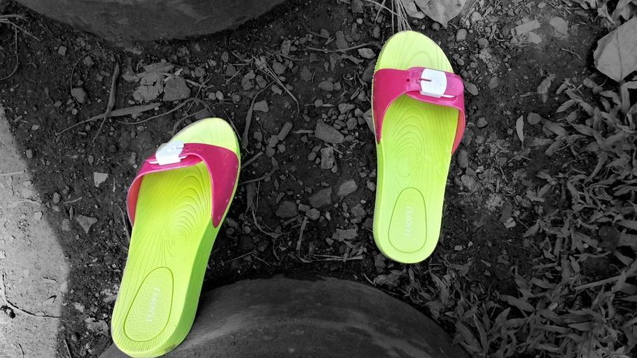 MAKE A MEME View Large Image sandals lemon colour bright colours pink bright yellow outdoor soil ground rocks nobody summer