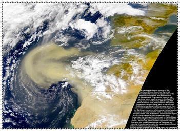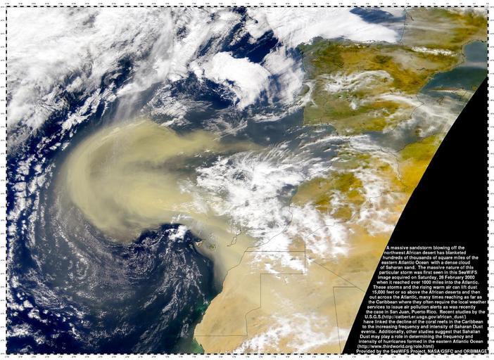 Keywords: Sandstorm big.jpg Explanation From low Earth orbit NASA's SeaWIFS instrument records ocean color tracking changes in our water world's climate and biosphere But even an ocean planet can have dust storms On February 26th SeaWIFS returned this dramatic close-up view of a vast developing cloud of Saharan desert dust blowing from northwest Africa lower right a thousand miles or more out over the Atlantic Ocean While there are indications that the planet-spanning effects of the Saharan dust events include the decline of the ecologies of coral reefs in the Caribbean and an increased frequency of Atlantic hurricanes there is also evidence that the dust provides nutrients to the Amazonian rain forests From space-based vantage points other satellite images have also revealed storms which transport massive quantities of fine sand and dust across Earth's oceans http //antwrp gsfc nasa gov/apod/ap000303 html Astronomy Picture of the Day http //antwrp gsfc nasa gov/apod/image/0003/feb26sandstorm_seawifs_big jpg 2000-03-03 http //seawifs gsfc nasa gov/SEAWIFS/IMAGES/SEAWIFS_GALLERY html SeaWIFS Project http //www gsfc nasa gov/ GSFC http //www nasa gov/ NASA Image Sahara_sandstorm JPG en Image Sandstorm big jpg PD-SeaWiFS Dust storms Astronomy Picture of the Day |