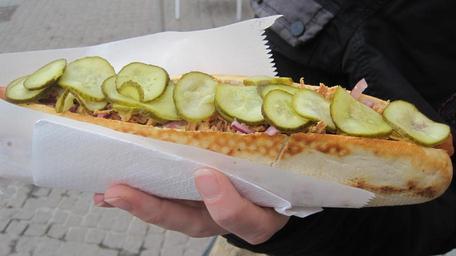 Keywords: sandwich baguette hot dog long roll bread occupied eat cucumber slices cucumber