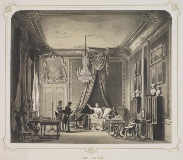 | Keywords: Sängkammarregementet.jpg sv Förlaga till litografin är en målning av Carl Stefan Bennet från 1830-talet i Kungl slottet Karl XIV Johan sätt att arbeta i och regera från sängkammaren kom att benämnas Sängkammarregementet http //app ub uu se/epub/bildsok/bibrecord cfm bibid 3935 Creator Carl Stefan Bennet 1843 <gallery> File Sängkammarregementet crop jpg File Karl Johan konfererer med embetsmenn fra sengen i sitt sove-og arbeidsværelse på Stockholms slott - Norsk Folkemuseum - NF 1915-0138 jpg </gallery> PD-old-100-1923 Stockholm in the 1830s Karl XIV Johans sängkammare Overdoors in Sweden Carl Stefan Bennet |