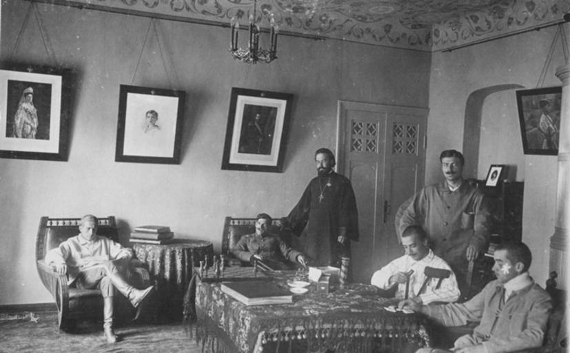 | Keywords: Sankt-Peterburg oldfoto 13727.jpg Ца ское Село Инте ье офице ского лаза ета в Белокаменной палате С анеными офице ами священник Алексей Киба дин будущий сомолитвенник п п Се афима Вы ицкого а стене сп ава ка тина В есте ова Tsarskoye Selo Russia http //oldsp ru/old/photo/view/15708 http //natalya-ugliadelckina narod ru/index/0-10 author 1916 PD-old Historical images of Tsarskoe Selo | ||||