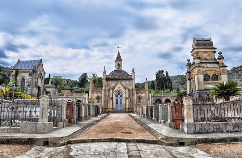 Keywords: sant feliu de guixols spain cemetery mausoleum headstones building architecture sky clouds walkway outside hdr