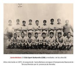 | Keywords: SANTA BARBARA A MEDIADOS DE LOS AÑOS 60.JPG Club Sport Barbareño es En 1944 el CSB ingresó en el fútbol organizado para participar en los torneos interdistritales e intercantonales realizados en la cancha de deportes ubicada frente a la Parroquia de Santa Bárbara Es de trascendental importancia mencionar que el primer club de fútbol de ese cantón se fundó el lunes 4 de marzo de 1907 por don Raúl Cortés; después de una reunión de entusiastas deportistas se dispuso bautizar a la naciente organización con el nombre de Club Ricaurte Posteriormente en los años venideros se comenta de la existencia de más equipos de fútbol formados en el pueblo barbareño; estas agrupaciones también entran en el rango categórico de clubes deportivos y se les llamó Club Sport Liberal el cual se fundó el lunes 10 de agosto del año 1908 Mientras que el Club Sport Oriente se Funda en 1921 es Club Sport Barbareño y Deportivo Machado F C son dos nombres de equipos de fútbol ligados íntimamente a Santa Bárbara de Heredia tercer equipo de aquella popular zona florense que llego a la primera división El Club Sport Barbareño se fundó el domingo 3 de enero de 1943 con jóvenes valores del futbol barbareño y el Deportivo Machado lo hizo en 1955 Ambos conjuntaban lo mejor que el campo futbolero había dado en aquella parte de Heredia para tomar posesión en diversos torneos amistosos y oficiales Santa Bárbara ingresa a la Liga Cantonal en la década de los 60`s Sin embargo es en la Liga Nacional de Tercera División que ostenta los campeonatos de 1962-1963-1964 y 1965 por la provincia de Heredia own AD Barbareña en los 80 2011-01-19 EL EQUIPO DE FUTBOL EN SANTA BARBARA DESDE 1960 A 1970 Entre tanto el Club Sport Barbareño se reforzaba con figuras de renombre para disputar también los famosos campeonatos de tercera división Entre estos jugadores podemos citar a Miguel A Vargas Fausto Solís Hugo Núñez Victoriano Vargas Adrian Ramírez Carlos Quesada Roger Salazar Carlos Rodríguez Carlos Morales León Hidalgo William Herrera Carlos E Ruiz Gerardo Víquez Everardo Salazar Edgar Murillo Danilo Calderón Gilberto Rodríguez Edwin Vega entre otros más que siguieron con el equipo hasta mediados de 1964 En 1968 el Club Sport Barbareño acepta jugar en el torneo de fútbol de la provincia de Heredia donde tomarían parte el Club Sport Floreño Deportivo Caribe F C de B° Mercedes Norte Club Sport Domingueño El Maracaná y La juvenil del Club Sport Herediano Cc-zero Group photographs of association football teams in Costa Rica |