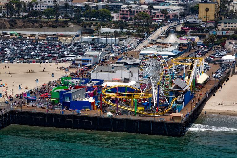 Keywords: santa monica california pier amusement park attractions tourism sea ocean seaside seashore vacation holiday aerial view hdr crowd leisure recreation rides ferris wheel city buildings beach