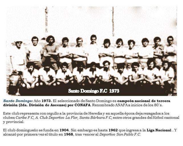 Keywords: SANTO DOMINGO DE HEREDIA OSTENTA SU TERCER CAMPEONATO EN 1973.jpg Santo Domingo F C es Santo Domingo tuvo como antecedentes a la A D Domingueña anteriormente Club Sport Domingueño equipo que militaba en los torneos cantonales en 1904 Los ciudadanos domingueños se interesaron por constituir un equipo que representara a Santo Domingo y que compitiera en la terceras y segundas divisiones de ascenso El 20 de septiembre de 1904 se funda el Club Sport Domingueño constituyendose la primera Junta Directiva integrada por su presidente don Eulogio Aguilar B Para la década de los 50`s se utiliza de base al Atlético Santa Rosa F C y Deportivo Danubio F C para competir en los torneos de canchas abiertas e interdistritales por Heredia es En los años 1949-50 los domingueños son campeones del torneo intercantonal de barrios o distritos por Heredia Primero le ganan a Santa Bárbara y luego a la Selección de San Pablo El club azul se alista para militar en la tercera división pero no le alcanza Vuelve a la carga y allí la selección domingueña Santo Domingo F C se consolida como club de fútbol costarricense siendo subcampeón en 1964 Y cuatro años después ostenta el título de Liga Nacional 1968 y de Tercera División 2da División de Ascenso en 1970-1973 own Fútbol Herediano 2013-01-25 Santo Domingo retorna a la liga federada 2006-2007 de 2da División de ANAFA cuarta división En la temporada 2009-2010 los domingueños logran su ascenso a la Primera División de LINAFA Y donde se encuentran compitiendo actualmente con un excelente rendimiento Cc-zero Group photographs of association football teams in Costa Rica Santo Domingo Heredia |