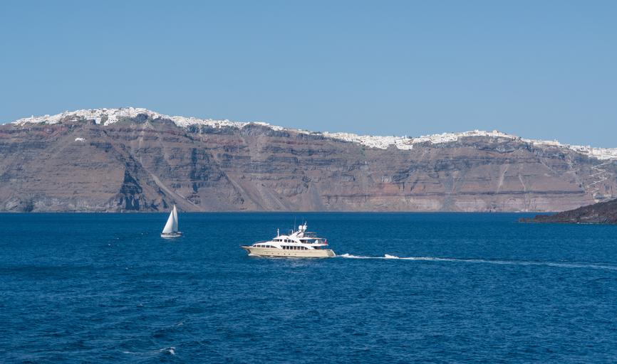 Keywords: santorini greece mountains cliffs sky water boats travel greek island vacation tourism mediterranean summer landscape seascape coastline nature sea