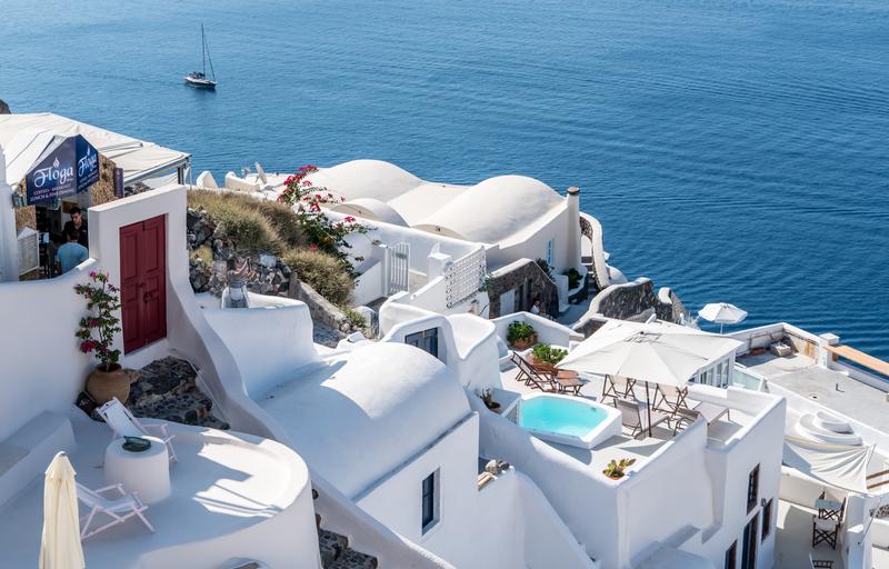 Keywords: santorini oia greece landscape travel summer greek tourism sea boat europe island mediterranean culture famous building outdoor water vacation white architecture touristic sky village
