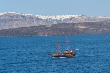 Keywords: santorini pirate ship mountains water scenery boat ocean vessel travel