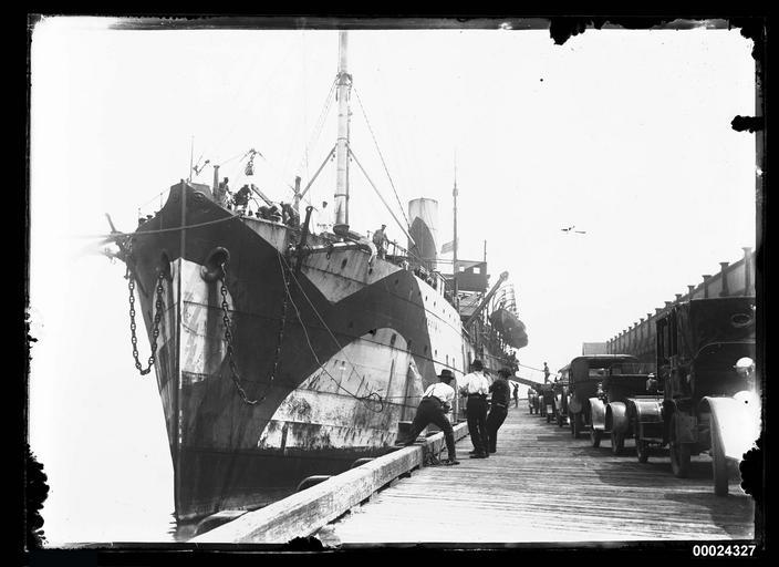 | Keywords: peninsular and oriental steam navigation company peninsularandorientalsteamnavigationcompany p & o line poline samuel j hood collection samueljhoodcollection hood collection hoodcollection dazzle paint dazzlepaint camouflage war troopship sardinia world war i worldwari wwi razzle dazzle razzledazzle dazzle camouflage dazzlecamouflage monochrome blackandwhite photo border outdoor black and white Troop transport SARDINIA in dazzle camouflage paint at a wharf during World War I.  This photo is part of the Australian National Maritime Museum’s Samuel J. Hood Studio collection. Sam Hood (1872-1953) was a Sydney photographer with a passion for ships. His 60-year career spanned the romantic age of sail and two world wars. The photos in the collection were taken mainly in Sydney and Newcastle during the first half of the 20th century.   The ANMM undertakes research and accepts public comments that enhance the information we hold about images in our collection. This record has been updated accordingly.   Photographer: Samuel J. Hood Studio Collection  Object no. 00024327 Troop transport SARDINIA in dazzle camouflage paint at a wharf during World War I.  This photo is part of the Australian National Maritime Museum’s Samuel J. Hood Studio collection. Sam Hood (1872-1953) was a Sydney photographer with a passion for ships. His 60-year career spanned the romantic age of sail and two world wars. The photos in the collection were taken mainly in Sydney and Newcastle during the first half of the 20th century.   The ANMM undertakes research and accepts public comments that enhance the information we hold about images in our collection. This record has been updated accordingly.   Photographer: Samuel J. Hood Studio Collection  Object no. 00024327 |