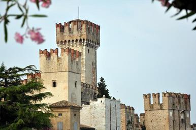 Keywords: Scaligero castle.jpg de Scaligero Castle am späten Nachmittag mit schönen Blüten in der linken oberen Bildecke unscharf aufgenommen own Wikisense 2010-07-02 Castle Sirmione