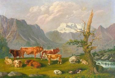 | Keywords: Scherrer Weidelandschaft.jpg Weidelandschaft in den Schweizer Bergen mit Katarakt und Gebirgshorizont oil on canvas 65 x 95 cm zeller de Johann Kaspar Scherrer 1739 “1806 PD-art Landscape paintings of Switzerland Agriculture in art Images from Auktionshaus Zeller |
