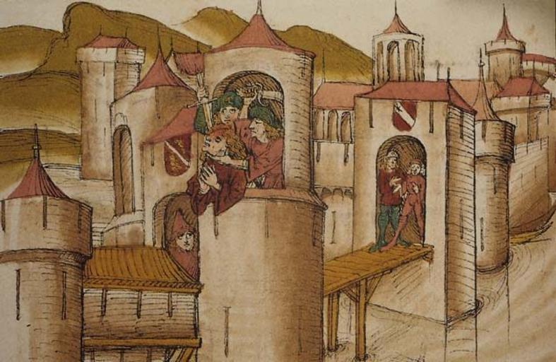 Keywords: Schilling Ermordung Eberhard von Neukyburg.jpg en Murder of Hartmann II of Neu-Kyburg by his brother Eberhard II castle Thun 1322 In the foreground the coat of arms of Neu-Kyburg in the background the coat of arms of the city of Thun de «Brudermord von Thun» Ermordung Hartmann II von Neu-Kyburg durch seinen Bruder Eberhards II auf Schloss Thun 1322 Im Vordergrund das Wappen der Familie Neu-Kyburg im Hintergrund das Wappen von Thun Spiezer Chronik des Diebold Schilling http //www habsburg net/index php id 127 creator Diebold Schilling 1485 PD-old-100 Spiezer Chronik Switzerland in the 1320s 1320 1485 Coats of arms of Thun Coats of arms of Neu-Kyburg family |