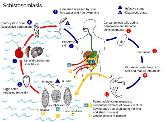 | Keywords: Schistosoma life cycle.svg en Eggs are eliminated with feces or urine 1 Under optimal conditions the eggs hatch and release miracidia 2 which swim and penetrate specific snail intermediate hosts 3 The stages in the snail include 2 generations of sporocysts 4 and the production of cercariae 5 Upon release from the snail the infective cercariae swim penetrate the skin of the human host 6 and shed their forked tail becoming schistosomulae 7 The schistosomulae migrate through several tissues and stages to their residence in the veins 8 9 Adult worms in humans reside in the mesenteric venules in various locations which at times seem to be specific for each species 10 For instance S japonicum is more frequently found in the superior mesenteric veins draining the small intestine A and S mansoni occurs more often in the superior mesenteric veins draining the large intestine B However both species can occupy either location and they are capable of moving between sites so it is not possible to state unequivocally that one species only occurs in one location S haematobium most often occurs in the venous plexus of bladder C but it can also be found in the rectal venules The females size 7 to 20 mm; males slightly smaller deposit eggs in the small venules of the portal and perivesical systems The eggs are moved progressively toward the lumen of the intestine S mansoni and S japonicum and of the bladder and ureters S haematobium and are eliminated with feces or urine respectively 1 2013-08-28 16 35 24 http //commons wikimedia org/wiki/File Schistosomiasis_Life_Cycle jpeg CDC cc-zero Uploaded with UploadWizard Schistosoma life cycle Theodor Bilharz |