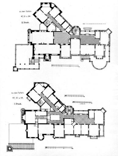| Keywords: Schloß Langenzell in Neckargemünd, Architekt L. Schäfer, Mannheim, älterer Teil v. Mythus & Bluntschli , Frankfurt a. M., Tafel 51, Grundriss, Kick Jahrgang I.JPG en Schloß Langenzell Wilhelm Kick Hrsg Moderne Neubauten 1 Jahrgang Stuttgarter Architektur-Verlag Kick Stuttgart 1895 Kicks Zeitschrift erschien in vier Ausgaben 1895 I 1898 II 1901 III und 1902 IV - siehe Katalog der Unibibliothek Saarbrücken Author 1895 Jahrgang I public domain PD-old Schloss Langenzell | ||||