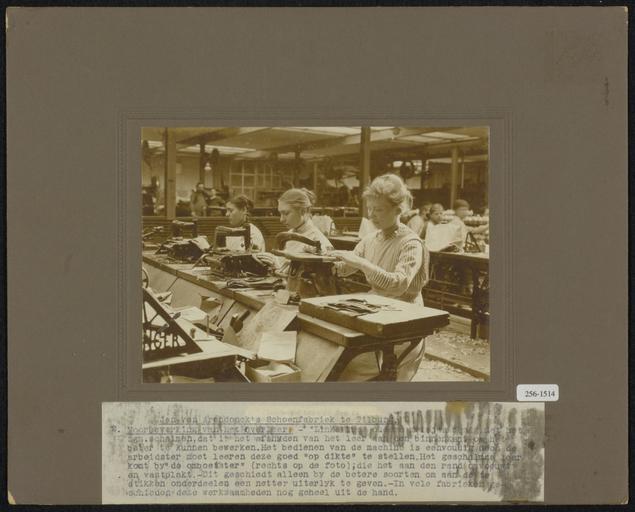 Keywords: nationaal archief nationaal archief nationaalarchief women sewing factory shoes facory Beschrijving: Voorbewerking van het overleer. De twee meisjes links zijn aan het 'schalmen', dit is het afsnijden van het leer aan de binnenkant om het beter te kunnen bewerken. Het bedienen van de machine is eenvoudig, maar de arbeidster moet leren deze goed op dikte te stellen. Het geschalmde leer komt bij de omboekster rechts op de foto; zij vouwt het leer aan de rand om en plakt het vast. Dit geschiedt alleen bij de betere soorten, om aan de te stikken onderdelen een netter uiterlijk te geven. In veel fabrieken geschieden deze werkzaamheden nog geheel met de hand Datum: Circa 1919 Vervaardiger: Fotograaf onbekend Formaat: 12 x 16.5 cm Bestanddeelnummer: 2.24.03_2252_256-1514 Fotocollectie: Arbeidsinspectie Auteursrechten: Nationaal Archief Voor meer informatie over het Nationaal Archief: www.nationaalarchief.nl Voor meer foto's uit deze en andere collecties, bezoek onze Beeldbank: beeldbank.nationaalarchief.nl/ Beschrijving: Voorbewerking van het overleer. De twee meisjes links zijn aan het 'schalmen', dit is het afsnijden van het leer aan de binnenkant om het beter te kunnen bewerken. Het bedienen van de machine is eenvoudig, maar de arbeidster moet leren deze goed op dikte te stellen. Het geschalmde leer komt bij de omboekster rechts op de foto; zij vouwt het leer aan de rand om en plakt het vast. Dit geschiedt alleen bij de betere soorten, om aan de te stikken onderdelen een netter uiterlijk te geven. In veel fabrieken geschieden deze werkzaamheden nog geheel met de hand Datum: Circa 1919 Vervaardiger: Fotograaf onbekend Formaat: 12 x 16.5 cm Bestanddeelnummer: 2.24.03_2252_256-1514 Fotocollectie: Arbeidsinspectie Auteursrechten: Nationaal Archief Voor meer informatie over het Nationaal Archief: www.nationaalarchief.nl Voor meer foto's uit deze en andere collecties, bezoek onze Beeldbank: beeldbank.nationaalarchief.nl/ |
