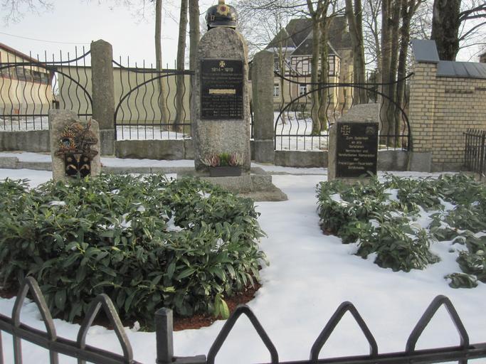 Keywords: Schönheide im Erzgebirge Feuerwehrdenkmal 2013.jpg de Das nach dem Ersten Weltkrieg errichtete Feuerwehrdenkmal an der Ecke Hauptstraße/Schneeberger Straße erinnert an die in diesem Krieg gefallenen Mitglieder der Feuerwehr Das Denkmal wurde mehrfach umgestaltet In den 2000er Jahren war die Tafel mit den Namen der Opfer des Ersten Weltkrieges entfernt worden Auf dem Granitstein in der Mitte war die jetzt auf dem Foto rechts zu sehende Tafel mit einem allgemein gehaltenen Gedenktext angebracht worden Er lautet žZum Gedenken an alle Gefallenen Vermissten und Verstorbenen Kameraden der Freiwilligen-Feuerwehr Schönheide sic Im Jahr 20013 wurde im Zuge einer Umgestaltung der mittlere Stein durch zwei neue ergänzt auf dem linken ist eine Eisengusstafel mit Feuerwehrsymbolen und auf dem rechten die vorstehend zitierte allgemeine Gedenktafel angebracht Der Text der ursprünglich einzigen Tafel ist wieder auf dem mittleren Stein zu lesen žZum ehrenden Gedenken der im Weltkriege gefallenen Kameraden der šFreiwilligen Feuerwehr ˜ zu Schönheide Pionier Kurt Klug + 16 9 1914 Pionier Hans Hertel + 20 4 1915 Steiger Arno Lenk + 8 9 1914 Steiger Paul Engelhardt 30 7 1915 Löschmann Herm Hösel 24 7 1915 Löschmann Karl Seidel 9 7 1915 Löschmann Emil Seidel 20 4 1917 Ob diese Tafel ein Neuguss ist oder die originale Tafel aus der Entstehungszeit des Denkmals ist bei einer Ortsbesichtigung nicht zu erkennen own Klaaschwotzer 2013-12-03 Feuerwehrdenkmal Schönheide Cc-zero |